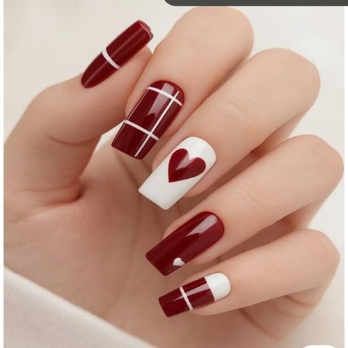 Playful long almond nails mix creamy white bases with cherry red accents, featuring scattered polka dots, tiny hearts, bold red ribbon bows with pearl centers,