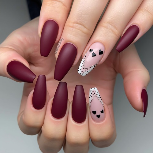 On the white-tipped nails, a single black heart near the cuticle creates a focal point, while the burgundy nails feature a gradient effect with scattered black polka dots and hearts, giving a textured, hand-painted look. This combination of matte and glossy finishes enhances the depth and visual appeal, making the nails appear both modern and timeless. The design is versatile, suitable for everyday wear or as a statement piece for special events.