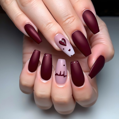 The “Burgundy Heartbeat Nails” design is a striking and elegant manicure that blends bold colors with delicate detailing. This nail art features a rich burgundy base, a deep wine-red shade that exudes sophistication and warmth, perfectly suited for the fall season or any occasion calling for a touch of drama. The design showcases a mix of long, coffin-shaped nails, with some painted entirely in matte burgundy, while others incorporate a contrasting white tip. The standout feature is the artistic application of black heart and polka dot accents, adding a playful yet romantic flair.