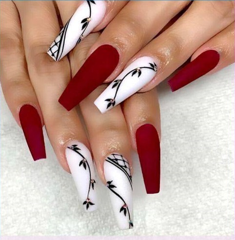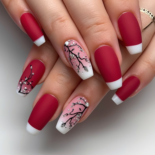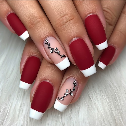 To achieve this look, start with a base coat, followed by a matte ruby red polish. Apply white polish to the tips of some nails, then use a fine brush to paint the black vine patterns with white highlights. Add rhinestones or glitter with tweezers or a dotting tool for precision. A top coat seals the design, ensuring longevity. Reflecting trends like matte finishes and floral accents, this style allows for personalization—try varying the vine design or adding more embellishments. “Ruby Vine Elegance Nails” combines rich color with intricate detailing, appealing to nail art lovers seeking a sophisticated yet creative look.