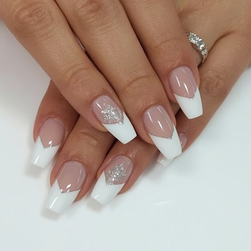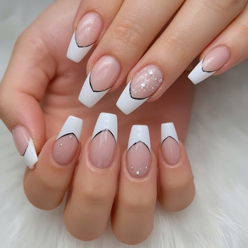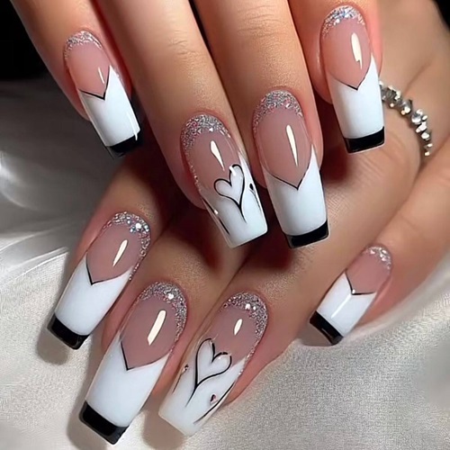 The “Elegant Heartline French Nails” design is a sophisticated take on the classic French manicure, infused with modern flair. This look features long, coffin-shaped nails with a neutral nude base, providing a soft and versatile foundation. The design is elevated by a bold white tip, framed with a sleek black outline, giving it a striking contrast and a polished finish. Adding a touch of sparkle, the tips are dusted with fine silver glitter, catching the light for a subtle yet glamorous effect.