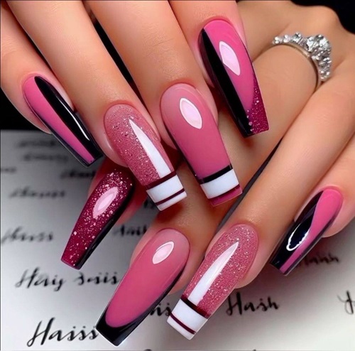The “Pink Passion Stripe Nails” design is a vibrant and modern manicure that combines bold colors with chic detailing. This look features elongated coffin-shaped nails, showcasing a stunning blend of hot pink and deep black hues. The base color, a glossy hot pink, radiates energy and femininity, complemented by a striking black diagonal stripe that runs across each nail, creating a dynamic contrast. Adding to the allure, some nails are adorned with a subtle glitter finish in a matching pink shade, catching the light with every movement.
