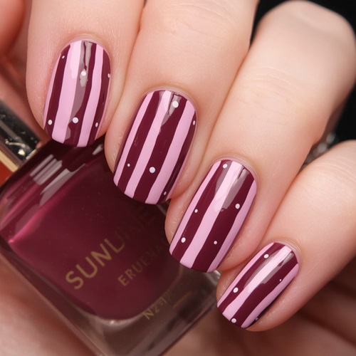 The image showcases a stunning manicure that blends bold colors and intricate designs, creating a look that exudes elegance and creativity. The nails feature a striking combination of deep plum and soft pink hues, with each nail showcasing a unique yet harmonious design. The base color, a rich plum, covers the majority of the nail, providing a sophisticated foundation. Overlaying this are vertical stripes in a delicate pink, adding a playful yet refined touch. Some nails are adorned with tiny white polka dots within the stripes, introducing a whimsical element that contrasts beautifully with the solid colors.