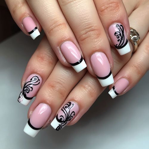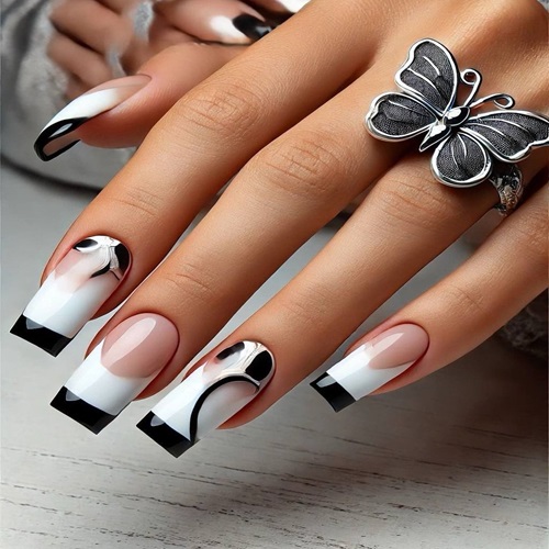This Chic Butterfly Elegance is a captivating blend of classic and modern nail art, exuding sophistication with a touch of whimsy. The nails feature a sleek, elongated square shape, painted with a neutral pink base that serves as a subtle canvas. The standout design includes bold black and white accents, with a French tip reimagined through a striking black outline framing the white tips. Intricate black swirls and curves flow across some nails, adding an artistic flair that draws the eye. This combination of sharp lines and flowing patterns creates a dynamic contrast, highlighting the skill involved in its creation.