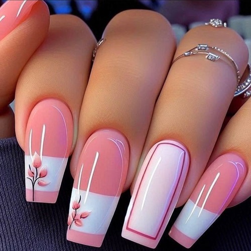 This manicure is a delightful fusion of classic French tips and delicate floral artistry, radiating a warm and elegant vibe. The nails feature a glossy coral-pink base, offering a vibrant yet sophisticated foundation that complements the season’s autumnal. Each nail showcases a modern twist on the traditional French manicure, with crisp white tips outlined in soft pink, creating a clean and polished look. The standout element is the intricate floral design on a couple of nails, where delicate black and white flowers with subtle shading add a touch of nature-inspired charm, likely crafted with fine brushes and high-quality polish.
