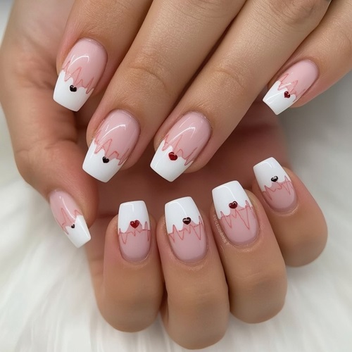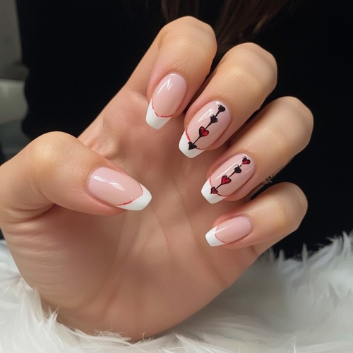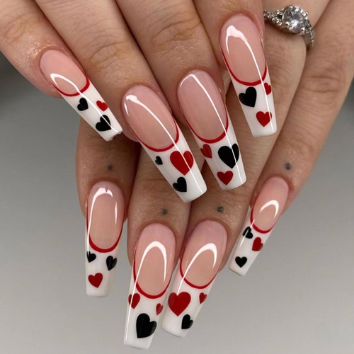 A delicate ring with a sparkling gem on one finger complements the design, adding a touch of glamour without overshadowing the nail art. The contrast between the nude base, white tips, and bold heart accents creates a balanced yet eye-catching effect, perfect for celebrations like Valentine’s Day or simply as a statement of personal style. The meticulous placement of the hearts—some solid, some outlined—showcases the skill and creativity involved, making each nail a miniature work of art.