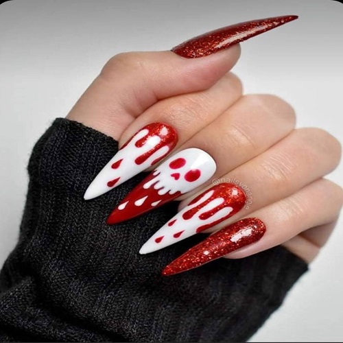 hese eye-catching nails embody a chilling yet chic Halloween aesthetic, blending spooky imagery with a glamorous finish. The design features a striking red base coat with a glittery texture, giving the nails a bold, festive shimmer that catches the light. The stiletto shape, sharp and elongated, amplifies the dramatic effect, making these nails a standout accessory. The centerpiece is a ghostly face with hollow eyes and a menacing grin, painted in white on one nail, with dripping red accents that mimic blood, enhancing the eerie theme. This blood-drip effect extends to the other nails, where red polish appears to run down the white tips, creating a cohesive and haunting look.
