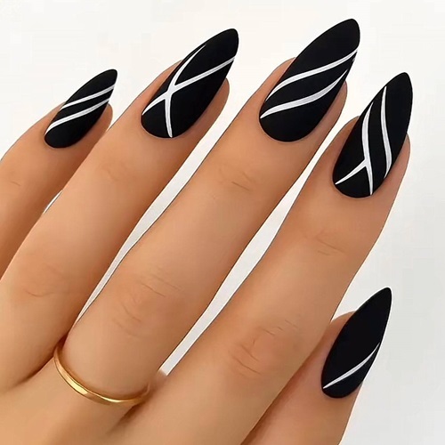 These striking nails exude a bold, minimalist elegance with a modern edge, perfect for those who love a sleek and artistic look. The design features a deep black base coat that creates a dramatic, almost velvet-like finish, setting a sophisticated tone. Over this dark canvas, crisp white lines form a striking crosshatch pattern, adding a dynamic and geometric flair. The lines vary in direction and thickness, creating a sense of movement and depth that draws the eye across each nail. The stiletto shape enhances the sharpness of the design, elongating the fingers and amplifying the overall impact.