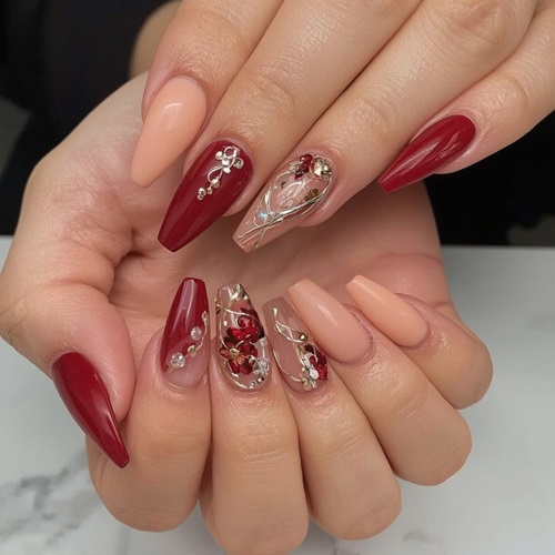 The Autumn Elegance Nail Design showcases a stunning autumn-inspired nail design that perfectly captures the essence of the season. The manicure features a blend of rich, warm colors and intricate details, making it a standout look for fall. The nails are shaped into a sleek, elongated almond style, providing a sophisticated base for the design. The color palette includes a deep burgundy red on the accent nails, paired with a soft, nude peach shade that transitions smoothly across the other nails. This gradient effect adds depth and a modern touch to the overall aesthetic.