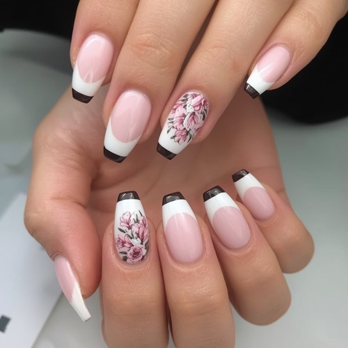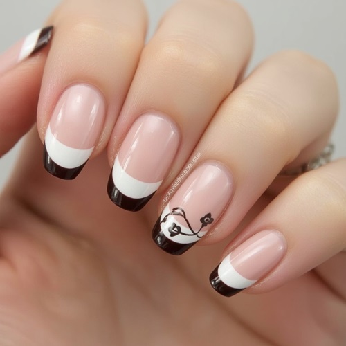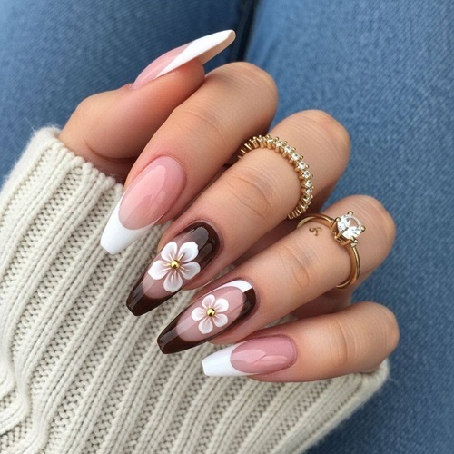 This image presents a captivating nail design that merges classic French tips with a modern floral twist, aptly named “Floral French Elegance.” The manicure features elongated almond-shaped nails, offering a sleek and elegant foundation. The design incorporates a soft pink base with crisp white tips, a hallmark of the traditional French manicure, but elevates it with a rich chocolate brown accent. This darker hue frames the tips of two nails, creating a striking contrast that adds depth and sophistication.