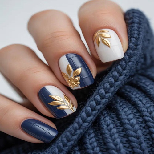 This image features a sophisticated nail design dubbed “Regal Navy Elegance,” blending royal aesthetics with intricate detailing. The manicure showcases medium-length, square-shaped nails with a striking two-tone base. The primary color is a deep navy blue, arranged in a grid-like pattern that covers the lower half of most nails, exuding a sense of depth and structure. This is complemented by a crisp white upper section, creating a bold yet balanced contrast that feels both modern and timeless. The design is elevated by the addition of delicate gold leaf motifs on two accent nails, where the metallic leaves are meticulously placed, adding a touch of opulence and nature-inspired artistry.
