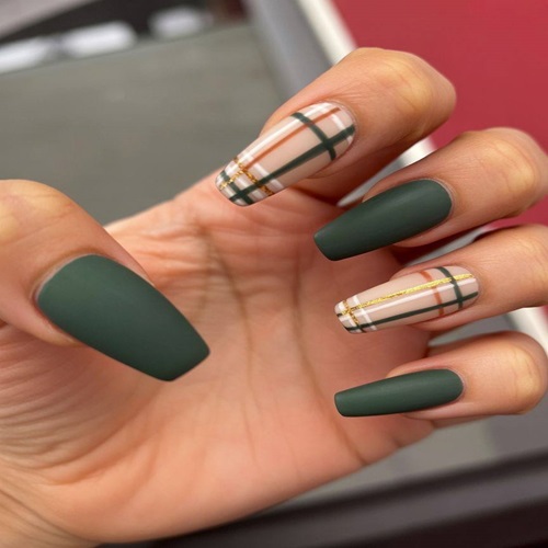 This image showcases a striking nail design named “Plaid Forest Glam,” blending rugged elegance with sophisticated patterns. The manicure features long, coffin-shaped nails coated in a deep forest green matte finish, evoking the rich hues of a dense woodland. This bold base color sets a luxurious tone, perfect for the autumn season. The design is elevated by intricate plaid accents on two accent nails, where a beige and tan checkered pattern is outlined with delicate gold lines, adding a touch of opulence and structure. This plaid motif, reminiscent of classic fashion textiles, brings a trendy yet timeless feel to the look.