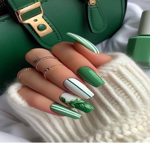 On one nail, the design elevates with delicate green leaf motifs painted over the white stripes, creating a botanical accent that ties the look to nature. These leaves, crafted with precision, bring a fresh and organic feel, making this manicure perfect for those who love subtle artistry. The combination of bold color and intricate detailing showcases a harmonious blend of simplicity and sophistication.