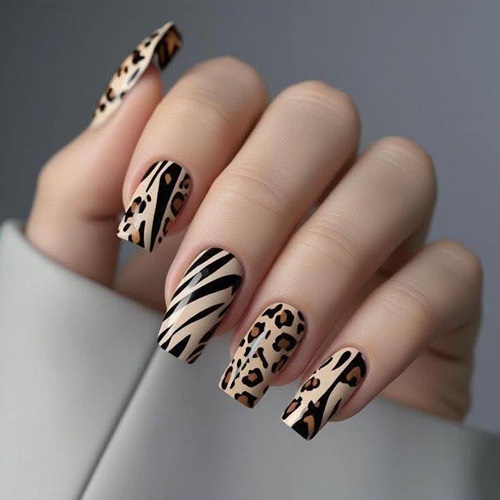 The “Wild Safari Chic Nail Design” is a bold and adventurous manicure that brings the untamed beauty of the savanna to your fingertips. This design features a stunning combination of neutral beige and black tones, mimicking the iconic leopard print pattern. The glossy finish enhances the depth of the spots and stripes, creating a striking contrast that exudes confidence and style. Each nail showcases a unique arrangement of the animal print, with some featuring full leopard spots while others incorporate sleek black vertical stripes, adding a modern twist to the classic motif.