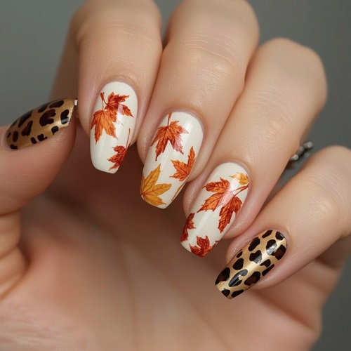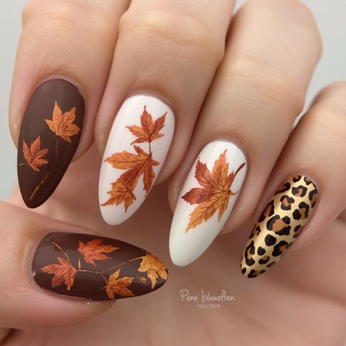 Adding modern flair to the traditional autumn theme, one nail features a contemporary leopard print pattern in warm browns and golds, providing textural contrast and visual interest. The almond-shaped nails elongate the fingers while maintaining a wearable, elegant silhouette.