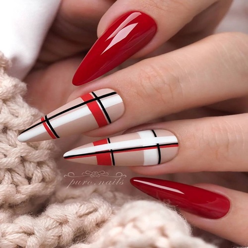 The standout feature is the classic plaid accent nail, rendered in traditional red, black, and white stripes that intersect to form the timeless tartan pattern. This checkered design adds a preppy, fashion-forward element that elevates the entire manicure from simple to spectacular. The geometric precision of the plaid demonstrates expert nail artistry and attention to detail.