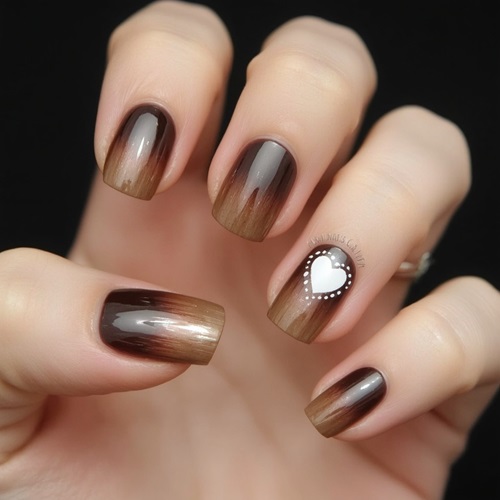 This nail design, dubbed “Chocolate Heart Elegance,” is a stunning blend of sophistication and charm. The manicure features a rich, chocolate-brown gradient that transitions smoothly from a deep hue at the tips to a lighter shade toward the base, creating a warm, ombré effect. The glossy finish enhances the luxurious feel, catching