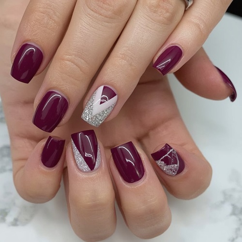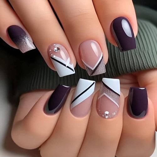 sophistication. The standout feature is the geometric interplay on the accent nails: crisp white triangular blocks intersect with nude bases, forming sharp V-shapes that draw the eye. Subtle glitter gradients fade from plum to silver at the tips of a few nails, adding texture and a frosted shimmer without overpowering the clean lines.