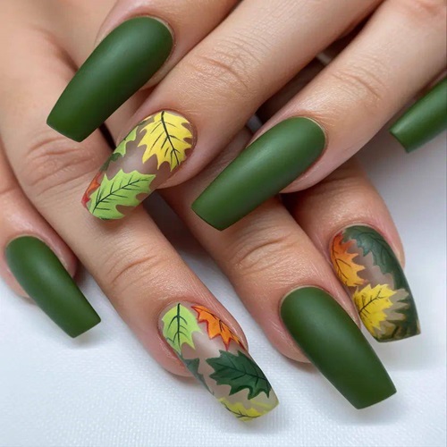The coffin-shaped nails elongate the fingers, enhancing the design’s modern and bold aesthetic while providing a perfect canvas for the leaf motifs. The matte finish contrasts beautifully with the glossy leaves, adding depth and visual interest. This design is ideal for those who love nature-inspired art and want a unique twist for the fall season, especially fitting. Perfect for both casual wear and special occasions, it pairs well with earthy tones or metallic accessories. Achieving this look may require a skilled nail artist to perfect the leaf detailing, but the result is a wearable masterpiece that captures the quiet magic of a forest in autumn.