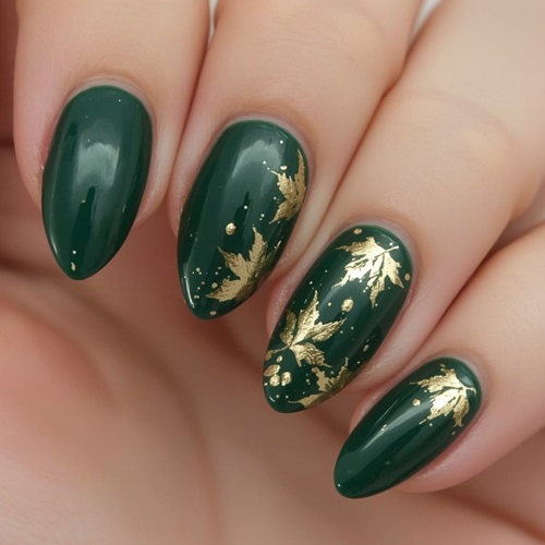 This manicure is perfect for seasonal celebrations, from Thanksgiving gatherings to elegant evening events. The combination of bold color and metallic detailing exudes confidence and style, making it a versatile choice for both casual and formal occasions. It’s a celebration of nature’s transition, blending the warmth of gold with the cool depth of emerald.