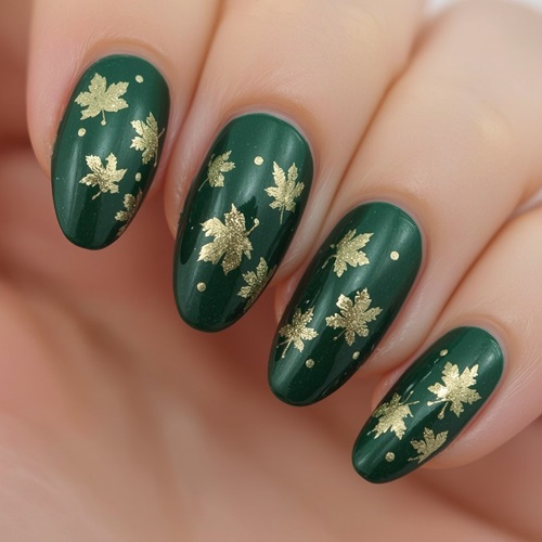 The standout feature is the intricate gold foil artistry. Delicate maple leaves, symbolizing the golden hues of falling foliage, are hand-painted or applied with precision on select nails. These metallic accents create a striking contrast against the dark green, evoking images of sunlit leaves drifting through crisp air. Tiny gold dots, strategically placed like dewdrops or scattered seeds, add a touch of whimsy and dimension, enhancing the overall sophistication.