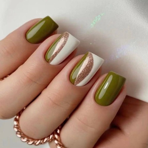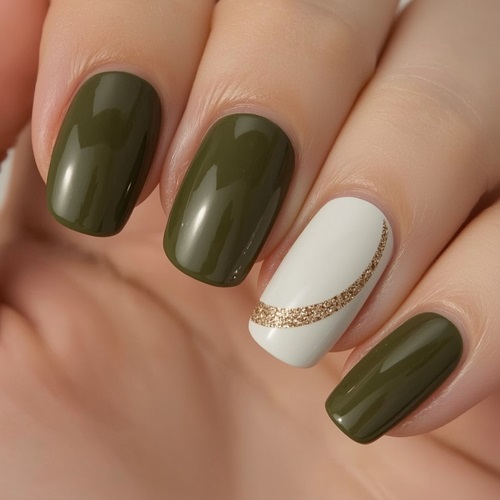 Achieve the look with a quality gel system: apply olive polish in two coats, cure thoroughly, then mask the diagonal on accent nails before adding ivory and glitter. Seal with a no-wipe top coat for mirror-like durability. “Olive Harvest Swirl” is understated luxury—quietly captivating, seasonally timeless, and perfectly polished.