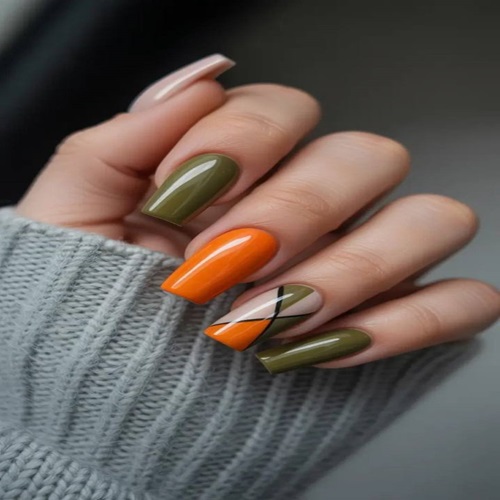 Harvest Plaid Fusion is a cozy, contemporary twist on autumnal charm. Square-tipped nails in a soft matte nude form the neutral canvas, grounding the design in understated elegance. Two nails gleam in glossy olive green—deep and earthy, like moss after rain—while a single bold tangerine orange nail bursts with citrus warmth, echoing fallen leaves under sunlight.