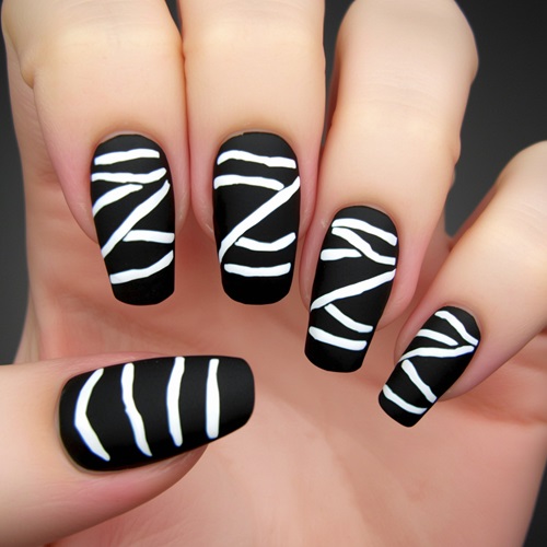 The “Mummy’s Gaze Matte Manicure” transforms fingertips into a playful yet eerie Halloween spectacle, perfect for spooky season. Each elongated coffin nail is coated in a deep matte black, evoking midnight shadows and mystery. White strips crisscross the surface in uneven, bandage-like patterns, mimicking ancient mummy wrappings with expert precision.