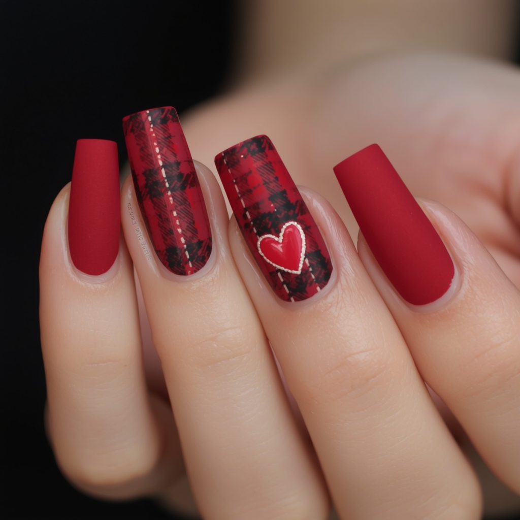 The standout feature is the accent nail on the ring finger, painted crisp white and adorned with a vibrant red plaid heart. This playful yet chic detail adds a touch of whimsy, perfect for holidays or romantic occasions. Adjacent nails showcase a complementary plaid pattern in red, black, and white, creating a cohesive tartan effect that ties the design together. The matte texture contrasts beautifully with the glossy lines of the plaid, adding depth and dimension.