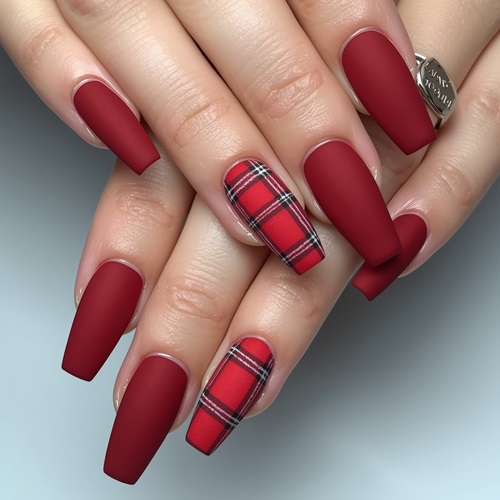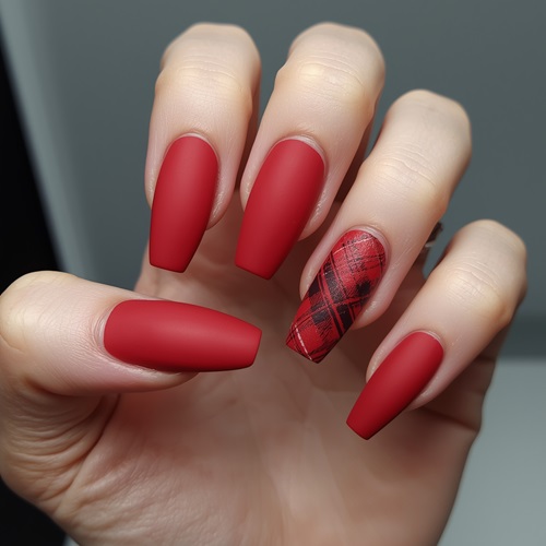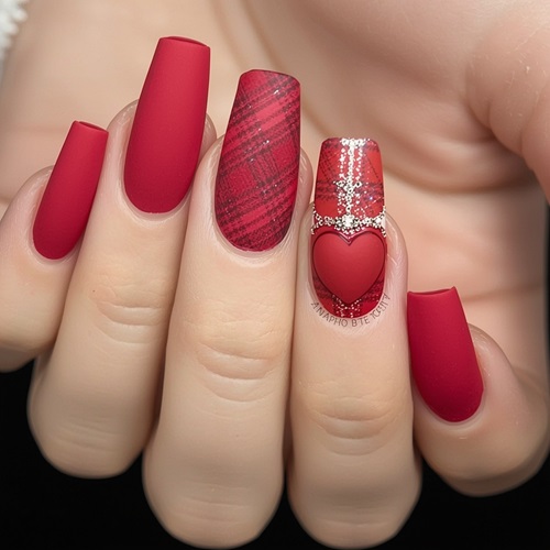 This striking nail design, dubbed the “Plaid Heart Matte Manicure,” blends bold red hues with intricate plaid patterns and a romantic heart accent for a modern, festive look. The majority of the nails feature a rich, matte red finish, exuding sophistication and warmth. The elongated coffin shape enhances the elegance, making fingers appear slender and refined.