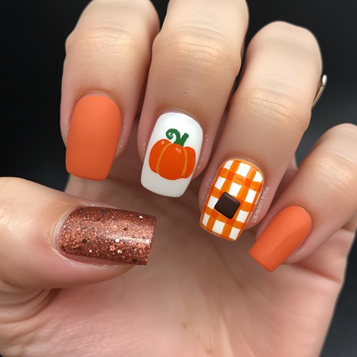 Accent nails steal the show: one boasts a glossy orange pumpkin with a curling brown stem and subtle white highlight, perched atop intersecting plaid lines in warm rust, gold glitter, and ivory. The tartan pattern weaves cozy sweater vibes into wearable art, while fine glitter threads catch light like fallen leaves under sunlight. Another nail mirrors the plaid in reverse, ensuring balance and harmony across the set.