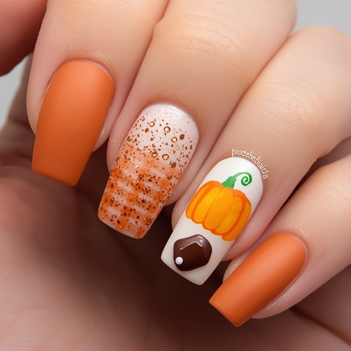 The “Pumpkin Patch Picnic Manicure” serves cozy fall vibes on a playful, mixed-shape palette. Square and coffin nails alternate, offering modern edge and classic comfort. A warm nude matte anchors the thumb and pinky, soft as sun-warmed soil. The index sparkles with fine bronze glitter, evoking crunchy leaves underfoot.
