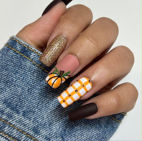 Center stage belongs to the ring finger: a glossy white base hosts a hand-painted orange pumpkin, its green stem curling like a vine. Delicate shading adds plump realism, while a tiny white highlight brings it to life. The middle nail flips the script with orange-and-white checkerboard, reminiscent of picnic blankets spread across harvest fields. A single brown square nods to chocolate treats tucked in baskets.