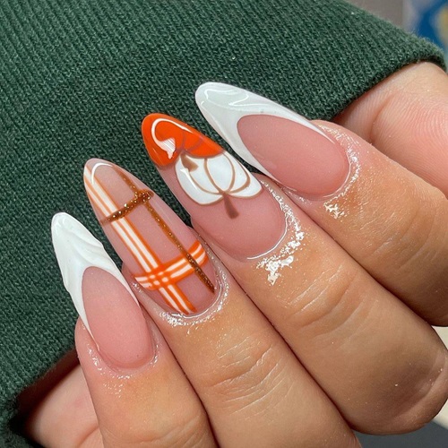 The “Harvest Pumpkin Plaid Manicure” captures autumn’s essence in delicate, almond-shaped elegance. A soft nude base acts as a canvas, allowing crisp white French tips to frame each nail with timeless sophistication. The glossy finish enhances the natural sheen, evoking dew-kissed mornings.