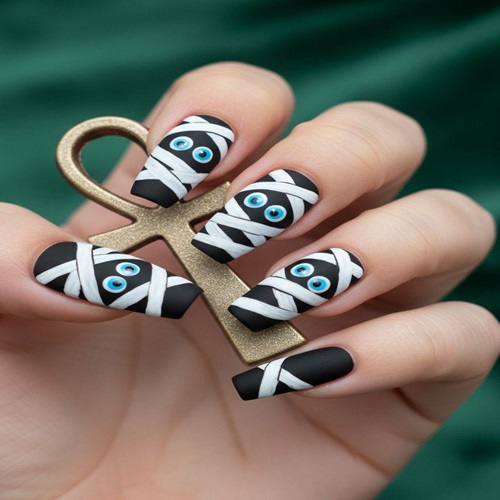 This manicure is ideal for costume parties, trick-or-treating, or simply embracing October vibes. Its bold contrast and detailed artistry demand attention, blending creepy with cute in a way that’s uniquely captivating. Pair it with a witchy ensemble or gothic jewelry for full effect. The Mummy’s Gaze Matte Manicure is a standout choice for anyone daring to wrap their nails in undead allure.