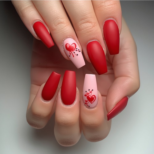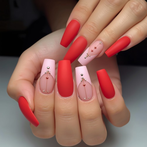 This captivating nail design, “Hearts in Bloom,” perfectly blends romance and modern elegance, making it an ideal choice for Valentine’s Day or any heartfelt occasion. The manicure features long, square-shaped acrylic nails with a matte finish that exudes sophistication. Three nails are painted in a bold, vibrant red, symbolizing passion and love, while the remaining two adopt a soft, nude pink base for a gentle contrast.