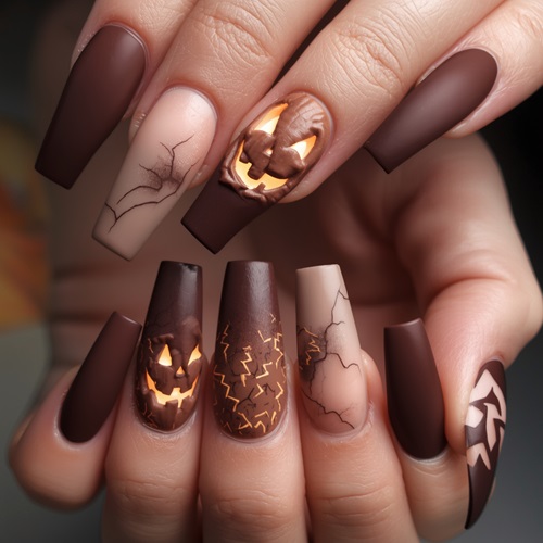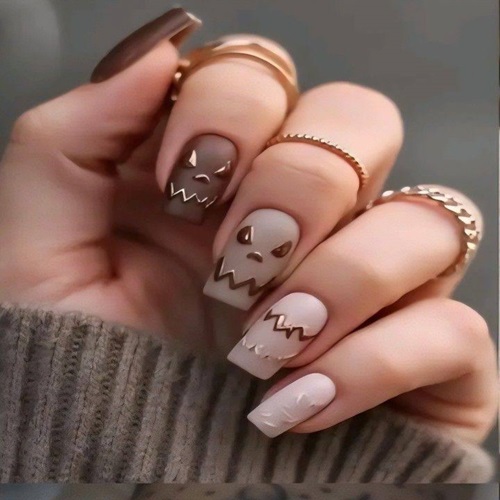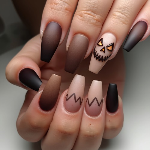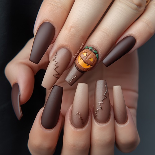Mocha Mischief is a hauntingly chic Halloween-inspired manicure that blends cozy autumn tones with playful spookiness. Long, sleek coffin nails showcase a gradient of matte mocha browns, from deep espresso to creamy latte, creating a warm, velvety canvas.