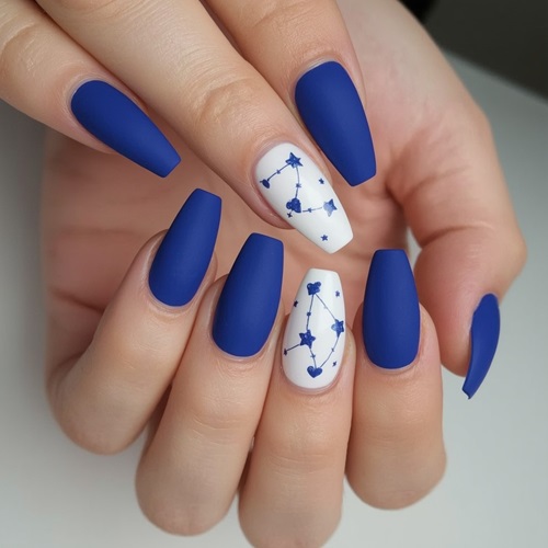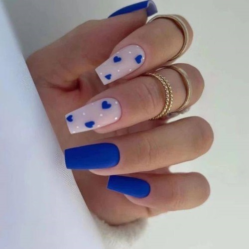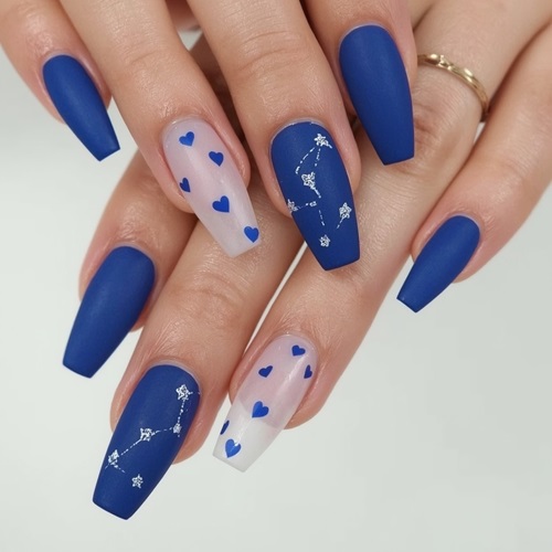 Cobalt Constellation” is a striking yet playful nail design that balances bold color with delicate charm. Long, tapered coffin nails feature a rich matte cobalt blue on three fingers, delivering unapologetic depth and modern edge. The remaining two boast a sheer milky base dotted with tiny, hand-painted cobalt hearts—each one a miniature star in a soft, dreamy sky. This negative-space approach keeps the look light and breathable, ideal for everyday wear or romantic evenings.