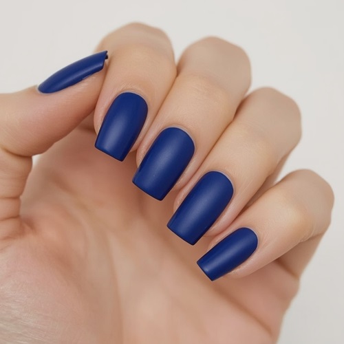 Sapphire Whisper” is a refined, minimalist nail design that fuses bold cobalt with understated elegance, perfect for the modern romantic. The manicure features medium-length square nails with a glossy finish on the blue accents and a velvety matte on the nude bases, creating a sophisticated textural contrast.