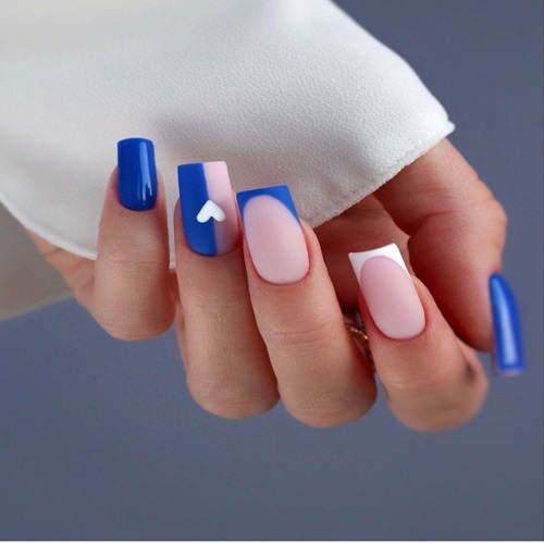 Three nails are coated in a deep, jewel-toned sapphire blue—rich, vibrant, and unapologetically striking—while two are left in a soft, barely-there nude pink, evoking quiet intimacy. The transition between colors is seamless, with one nail showcasing a diagonal split: glossy sapphire meeting matte nude, bridged by a delicate white heart outlined in fine black. This subtle heart serves as the emotional centerpiece, symbolizing love without overwhelming the design.