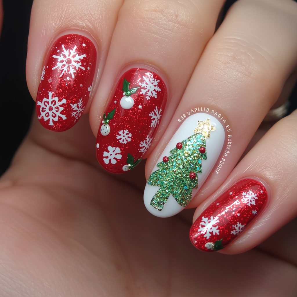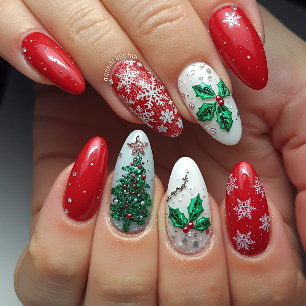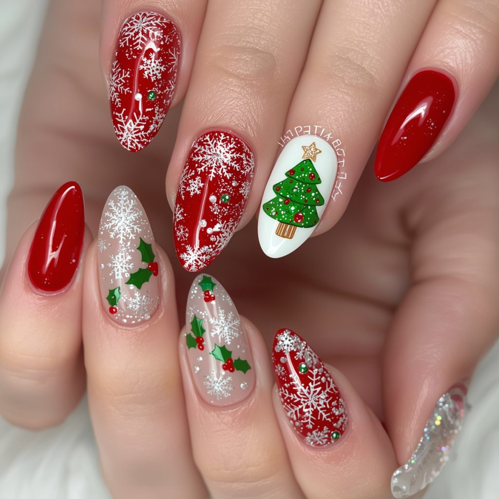 This stunning Christmas nail art design captures the essence of the holiday season with vibrant red, green, and white hues. The nails feature a glossy red base on most fingers, adorned with intricate white snowflake decals that evoke a winter wonderland. One nail stands out with a charming Christmas tree motif, complete with green glitter, tiny red ornaments, and a sparkling star at the top. Another nail showcases holly berries and leaves, adding a classic festive touch. The almond-shaped nails are elegantly elongated, enhancing the sophisticated look.