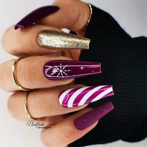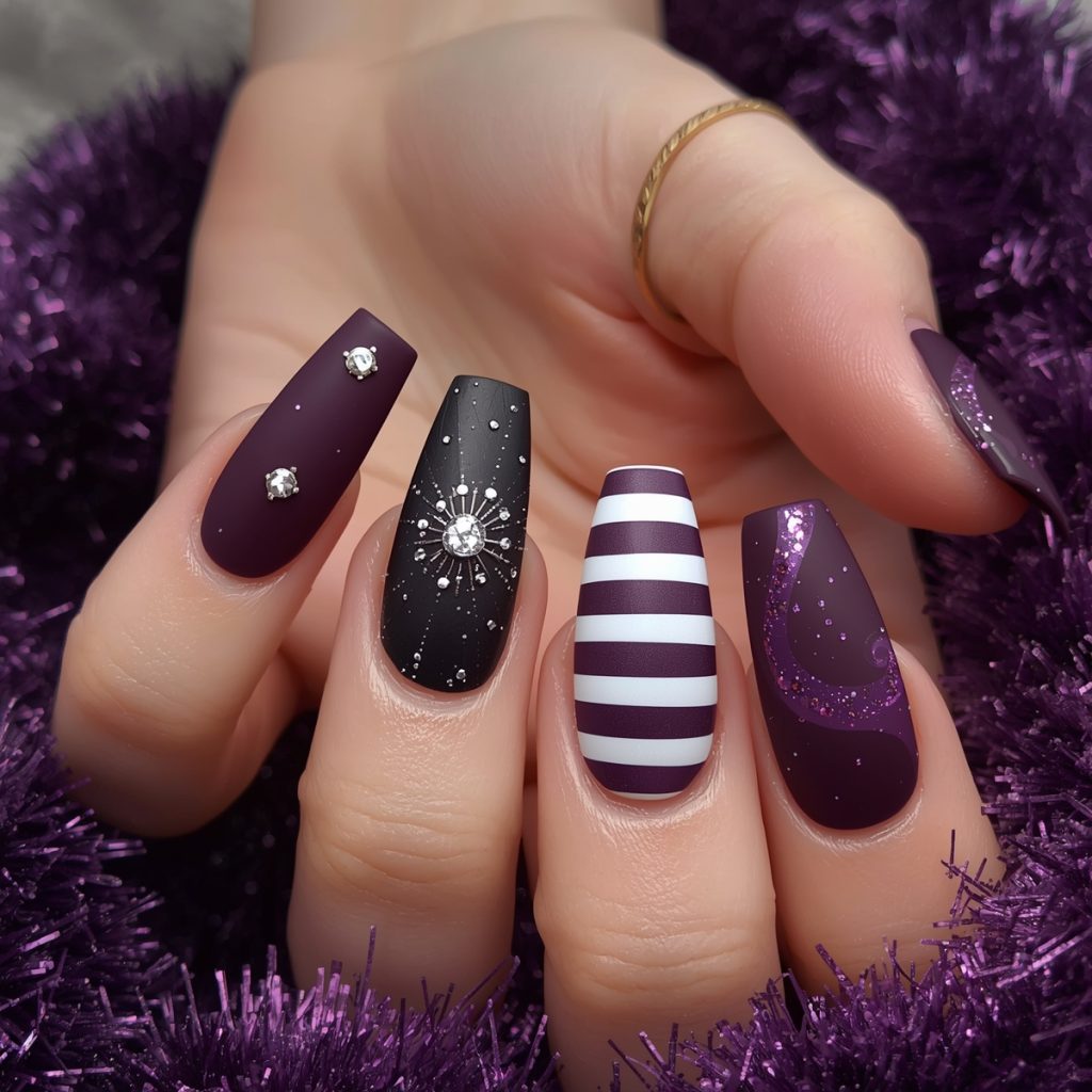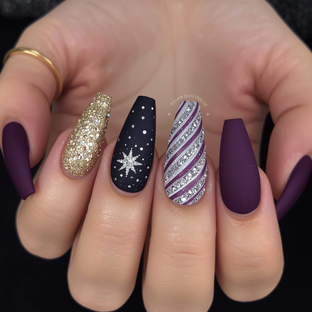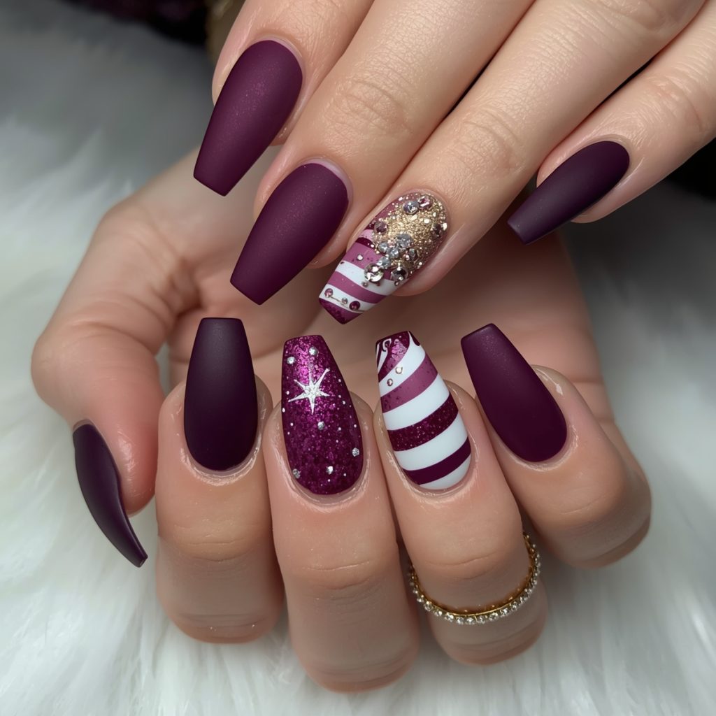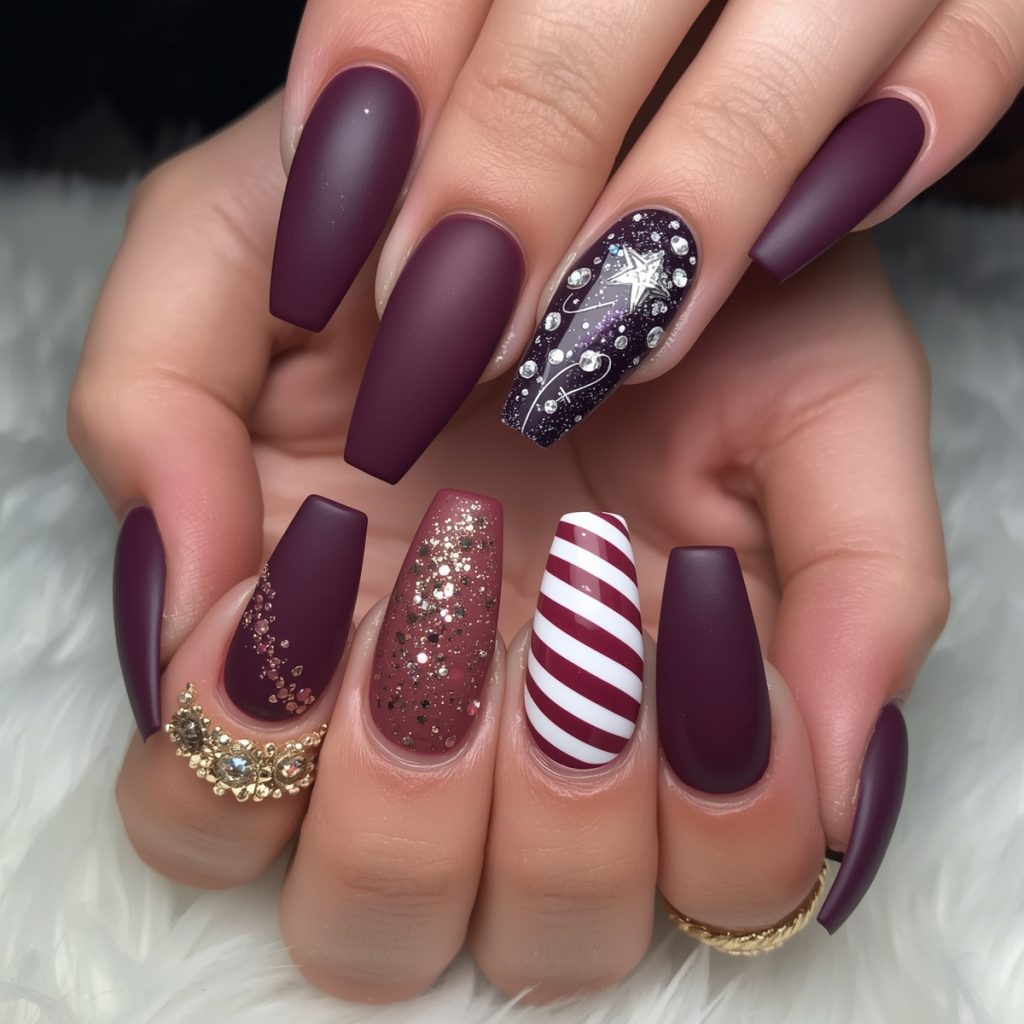 This luxurious winter manicure radiates opulent charm with deep plum as its regal canvas. Long coffin-shaped nails alternate between glossy and matte finishes, creating tactile drama. A shimmering gold-glitter accent nail catches light like champagne bubbles, while a cosmic midnight-plum nail hosts a delicate silver starburst with orbiting rhinestones, evoking a celestial celebration. Bold candy-cane stripes in crisp white swirl across another nail, injecting playful festivity into the sophisticated palette.