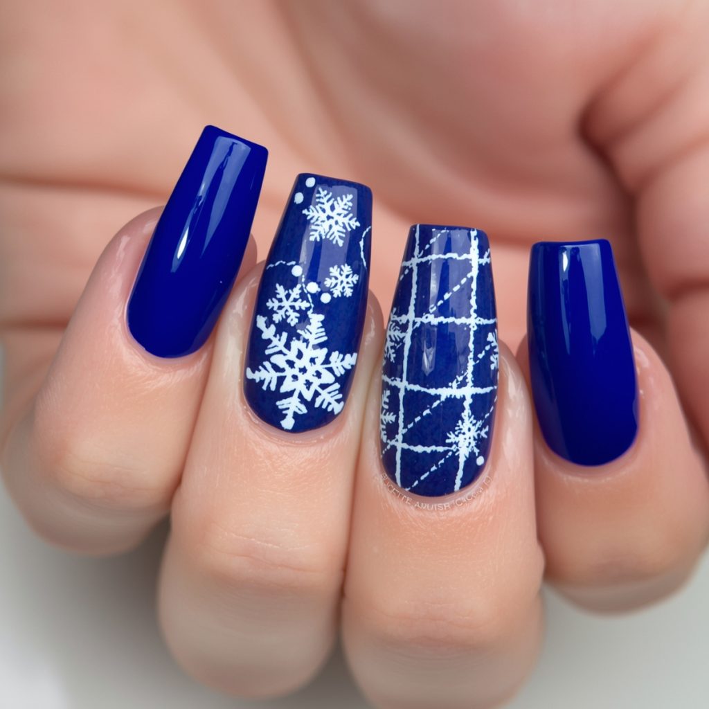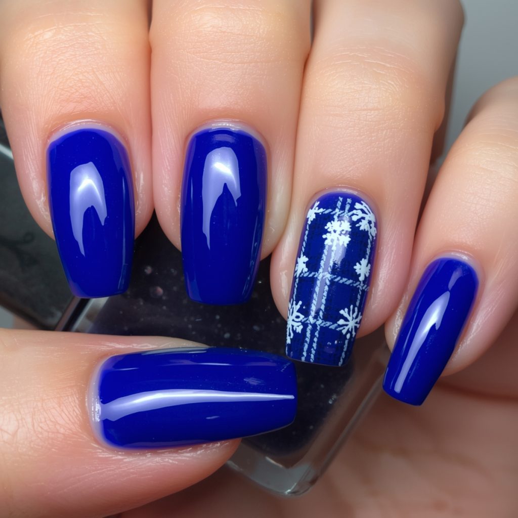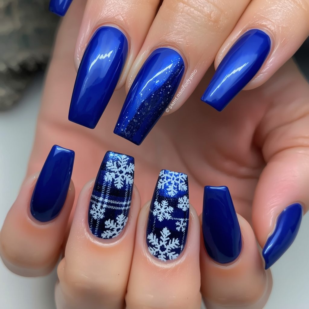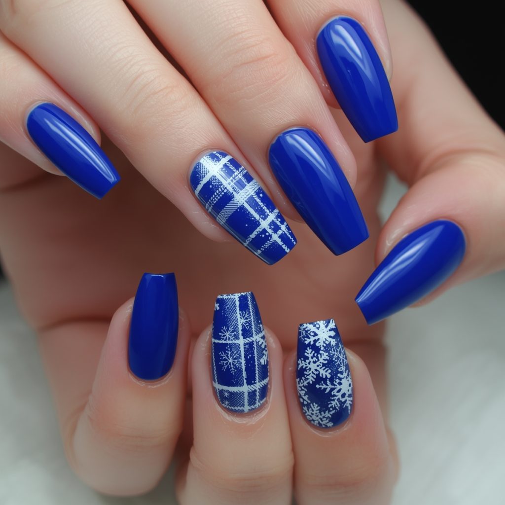 This cozy-chic winter manicure wraps nails in a vibrant cobalt-blue embrace, evoking crisp alpine nights. Long coffin tips gleam with high-shine polish, while two accent nails channel rustic flannel via delicate white plaid lines crisscrossing the sapphire base. Intricate white snowflakes bloom across the pattern, their lacy edges hand-painted for artisanal charm.