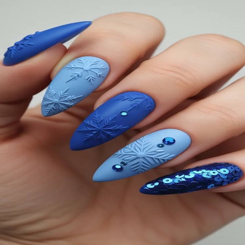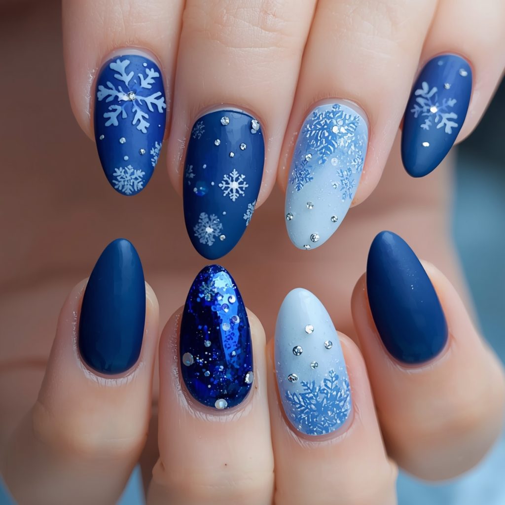 One accent nail gleams with midnight-blue micro-sequins, creating a mesmerizing depth reminiscent of a starry winter night. The matte texture on select nails enhances the velvety feel of fresh powder, while glossy tips reflect holiday lights. Perfect for elegant soirées or quiet snowy evenings, this manicure embodies sophisticated frost-kissed beauty, blending artisanal detail with modern minimalism to celebrate the quiet magic of winter.