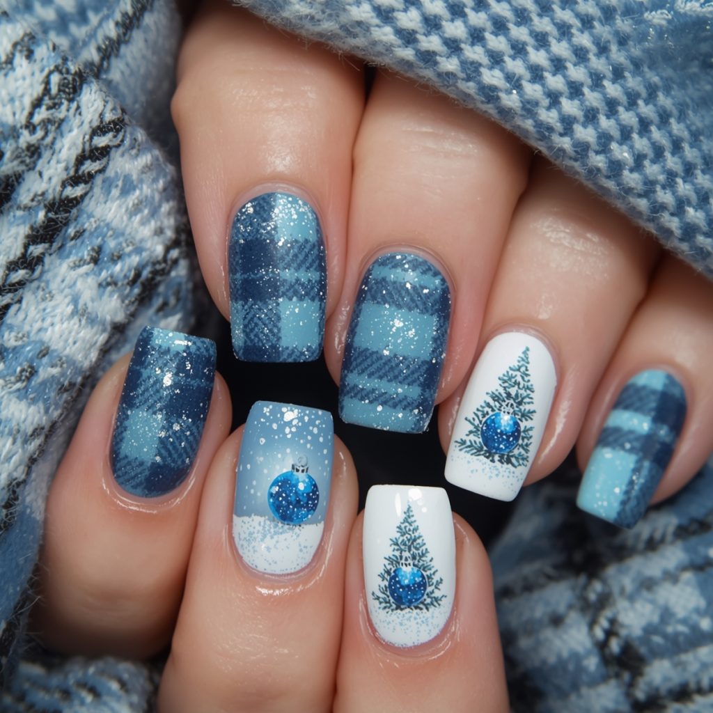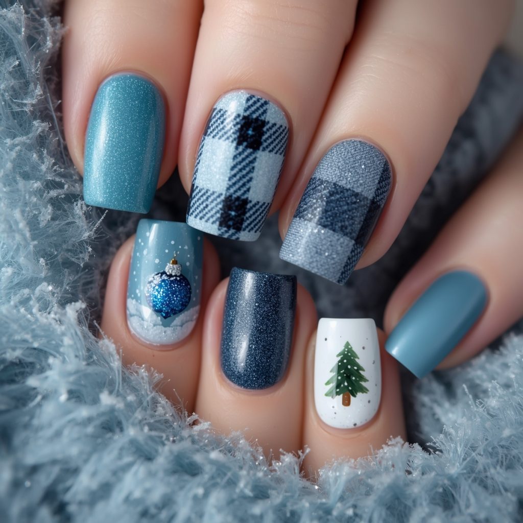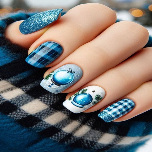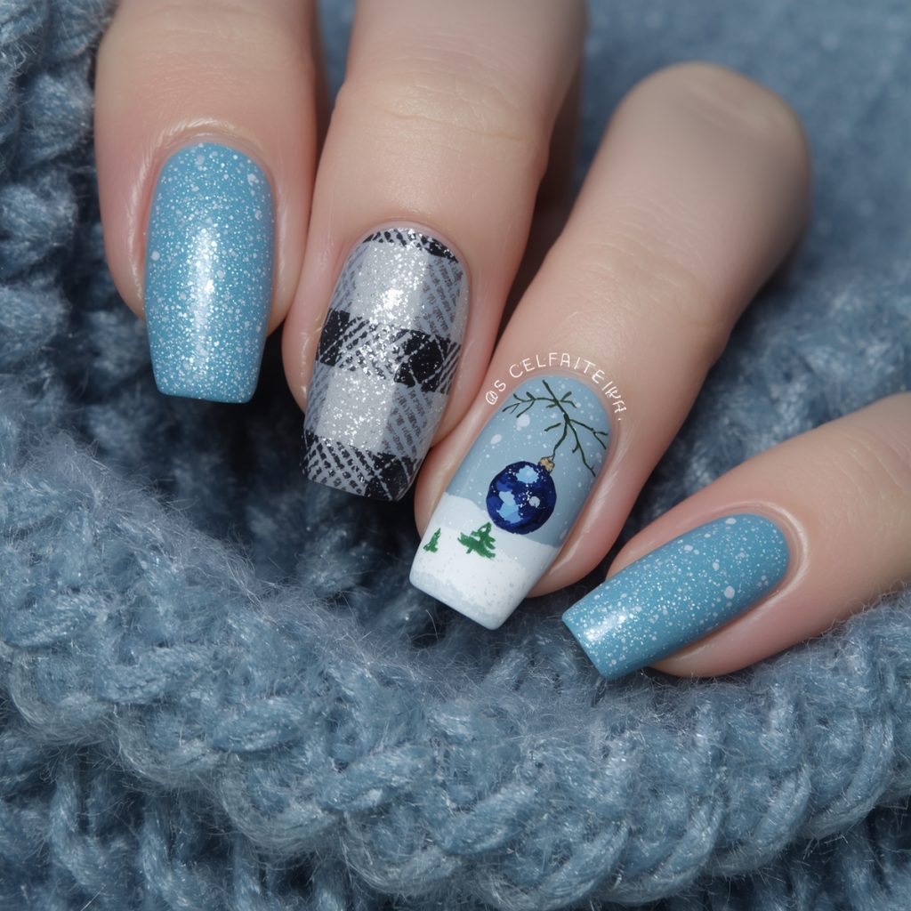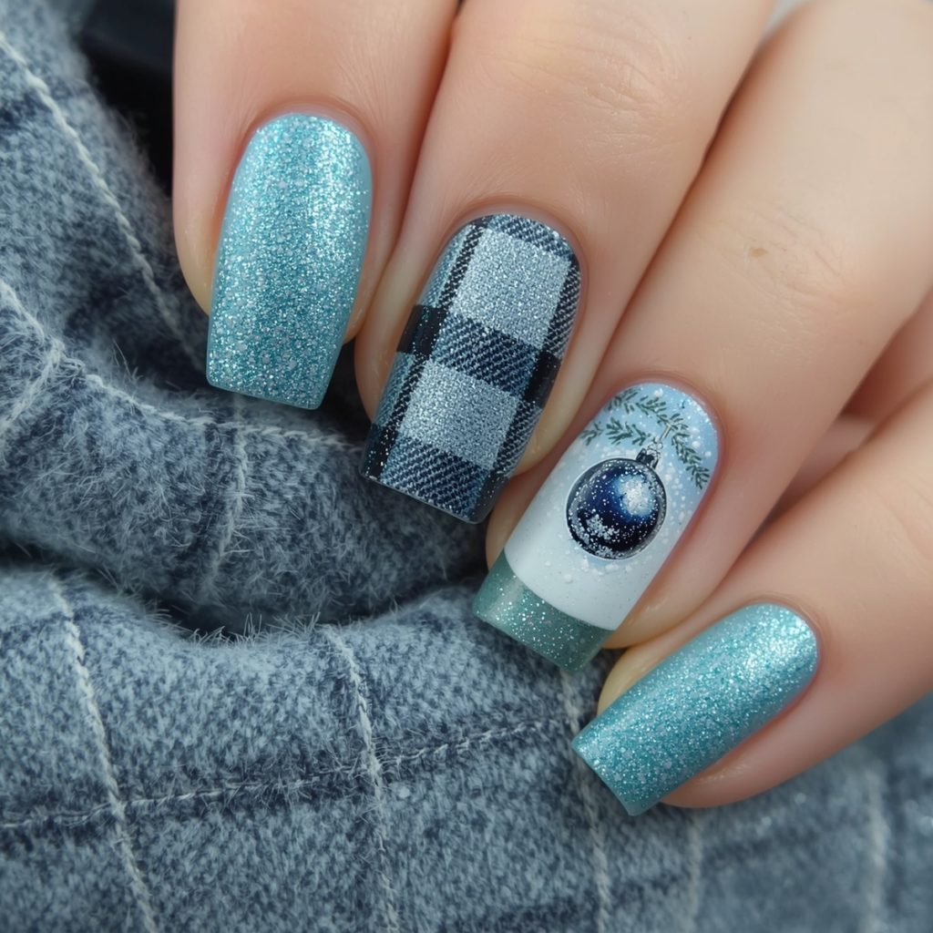 This cozy-chic manicure wraps winter in a soft flannel embrace. Square-shaped nails glow in icy blues: two drenched in frosted turquoise glitter that twinkles like fresh powder, two wrapped in classic buffalo plaid in muted denim tones, and two painted crisp white as the perfect canvas for the stars of the show (delicate hand-painted snow globes).