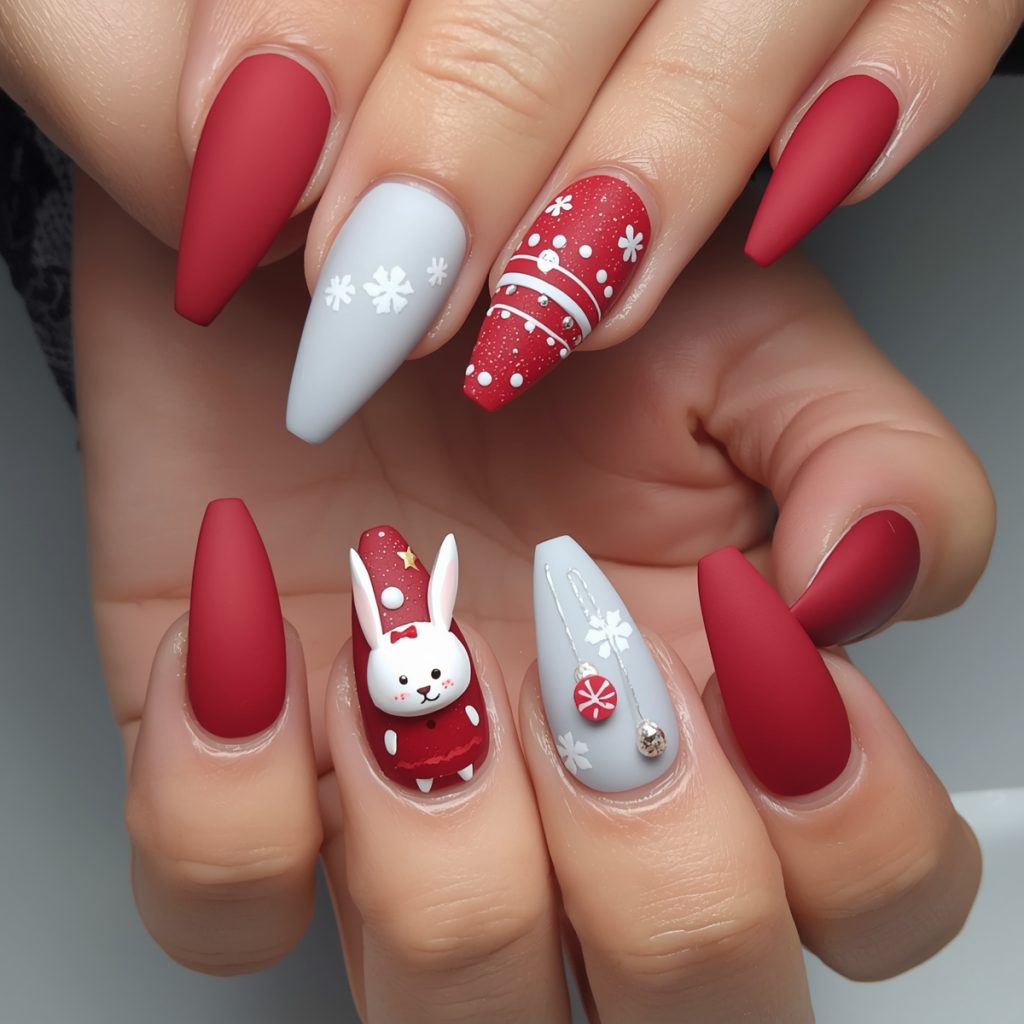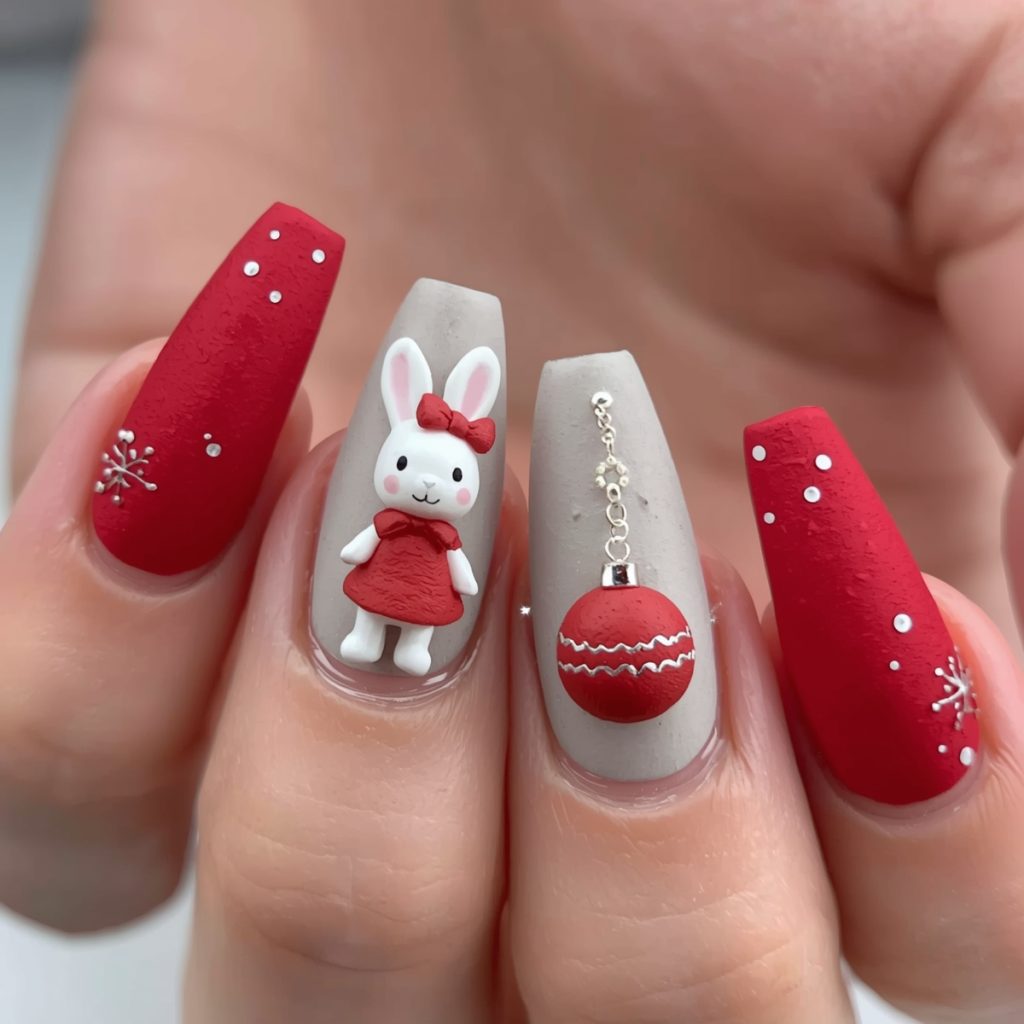The real magic happens on the accent nails: a tiny 3D white bunny in a scarlet dress and bow stands proudly, cheeks blushing and ears perked, while neighboring nails dangle hand-painted red ornaments with delicate white stripes and silver caps, swaying as if hung on an invisible tree.