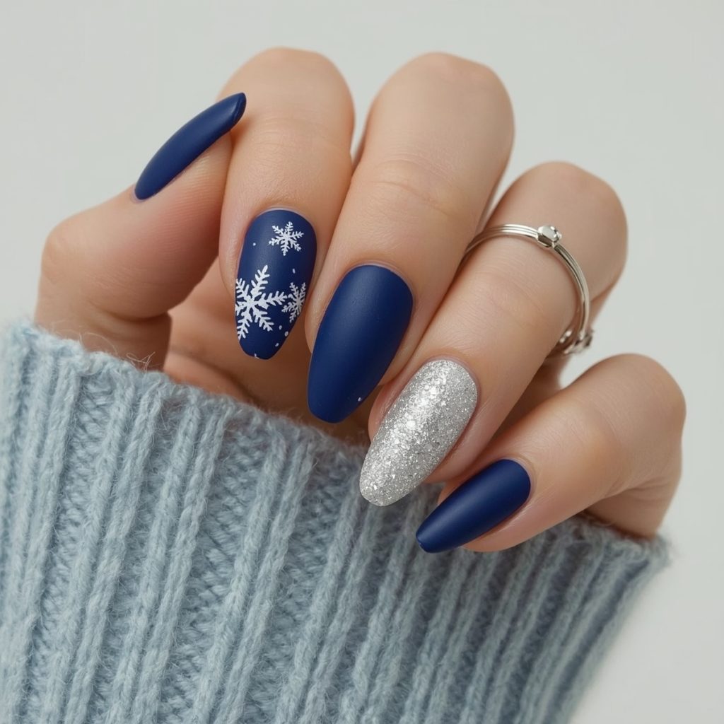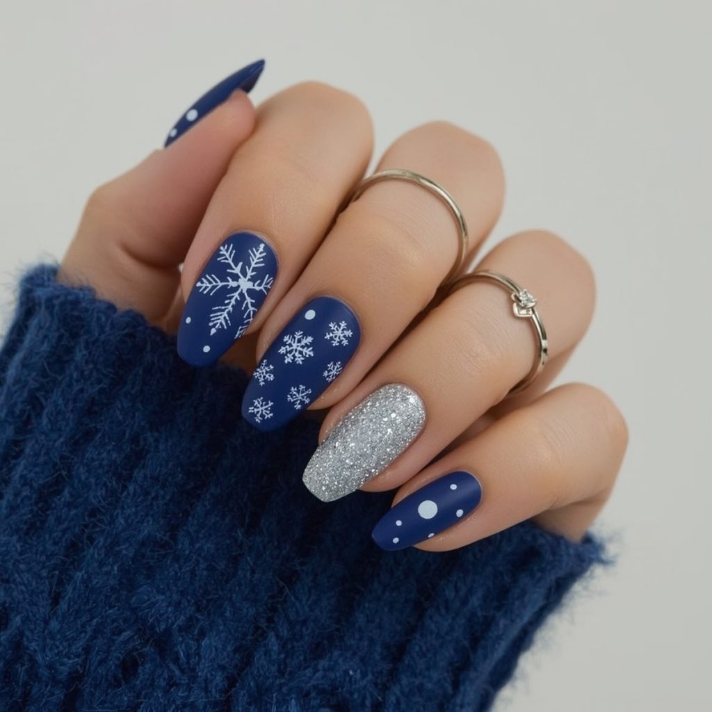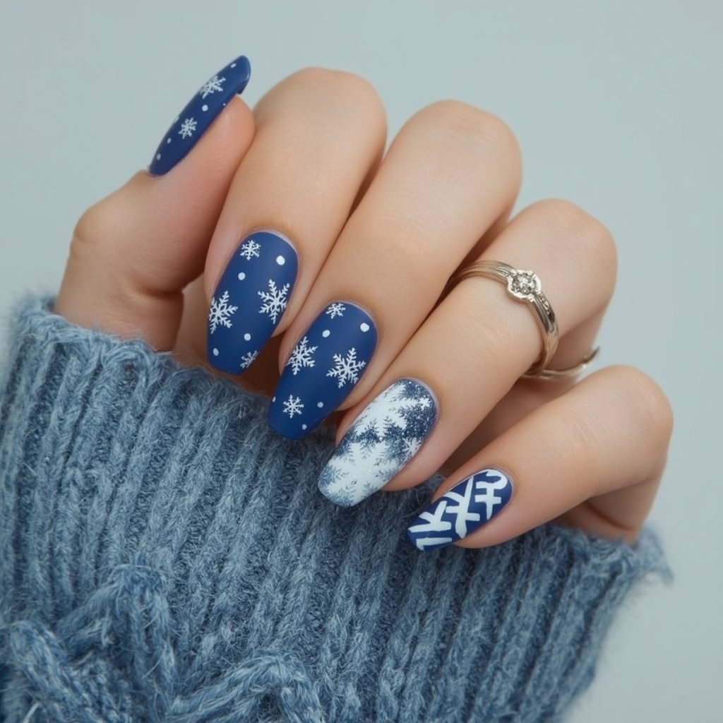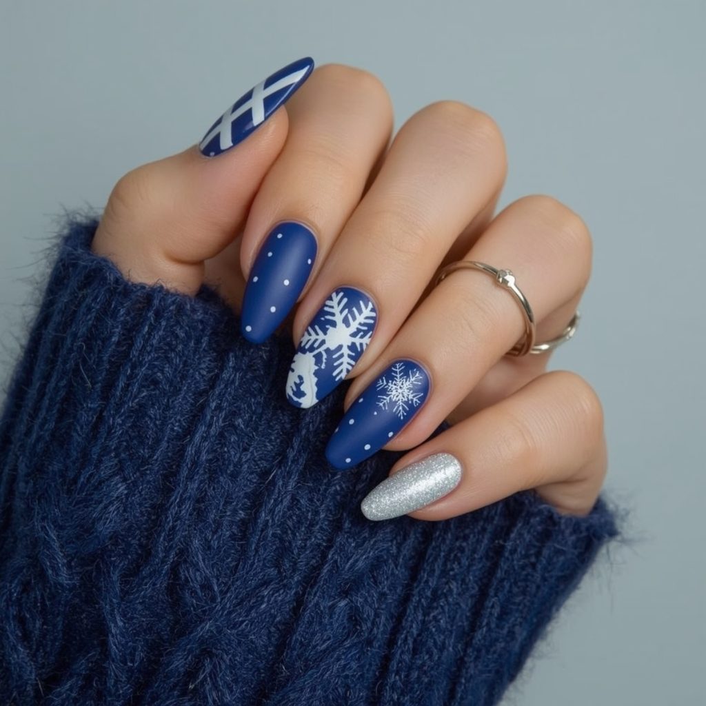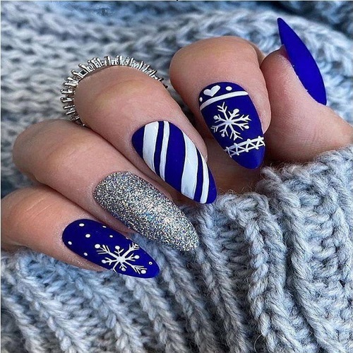This luxurious winter manicure is a love letter to cozy nights and glittering snow. Rich royal sapphire coats most nails in a velvety matte finish, while crisp white diagonal stripes on one accent nail evoke classic Fair Isle knit patterns. Delicate hand-painted snowflakes in intricate lace-like detail float across several nails, each unique and frosted with tiny silver dots like freshly fallen flakes.