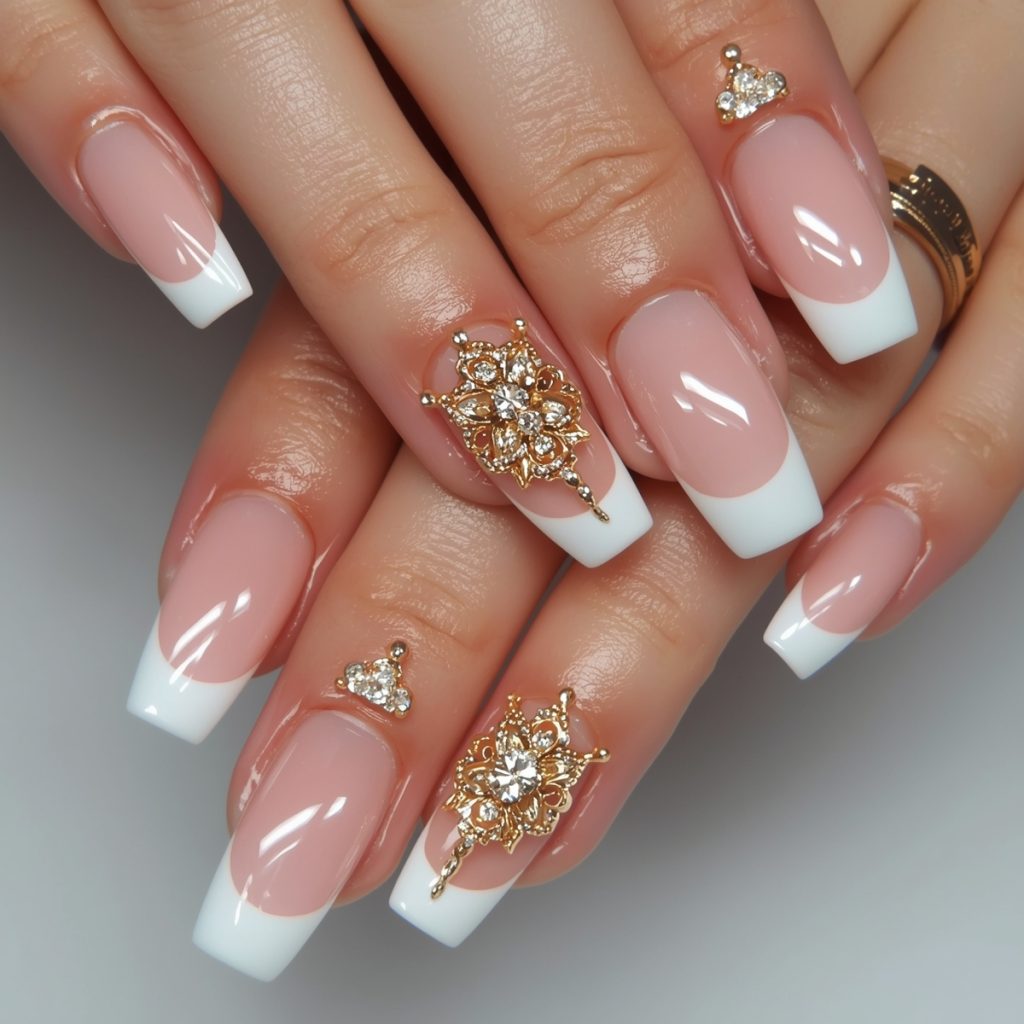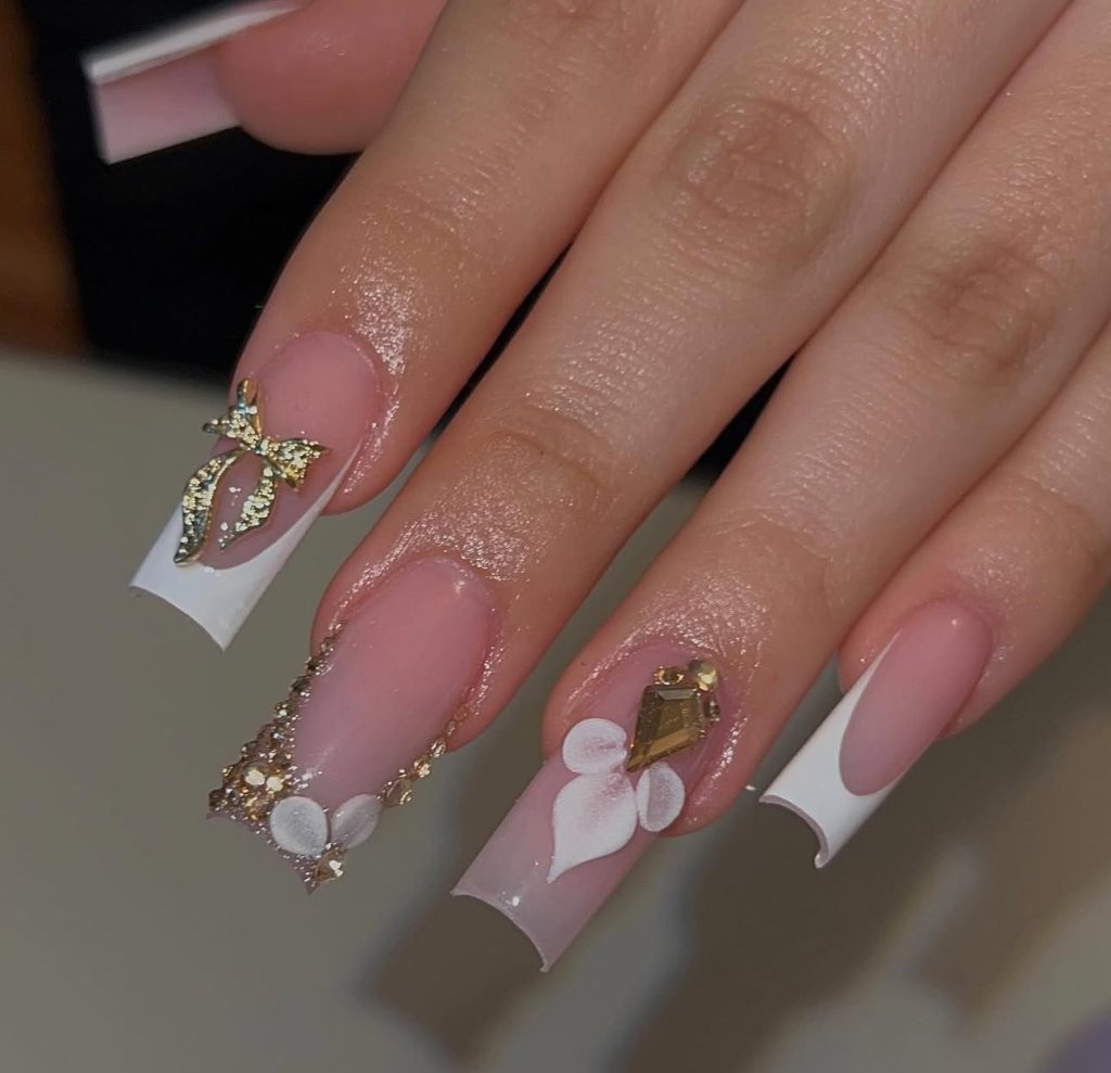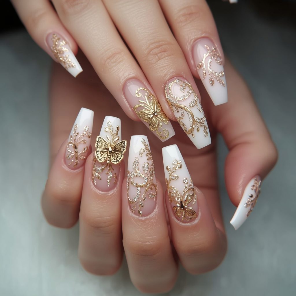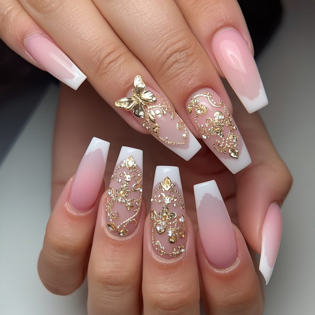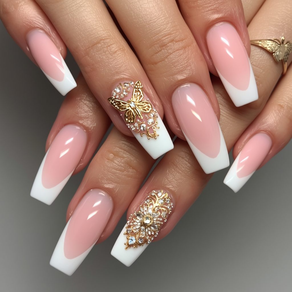 An opulent twist on the classic French manicure, this set features long, sculpted square-tipped nails in a soft nude-pink base with pristine white French tips. The design is elevated to bridal-luxury status through lavish gold detailing: delicate 3D gold butterfly charms flutter on the ring finger, while the pinky and index nails showcase intricate hand-painted gold foil lace and micro-crystals that catch light with every movement.