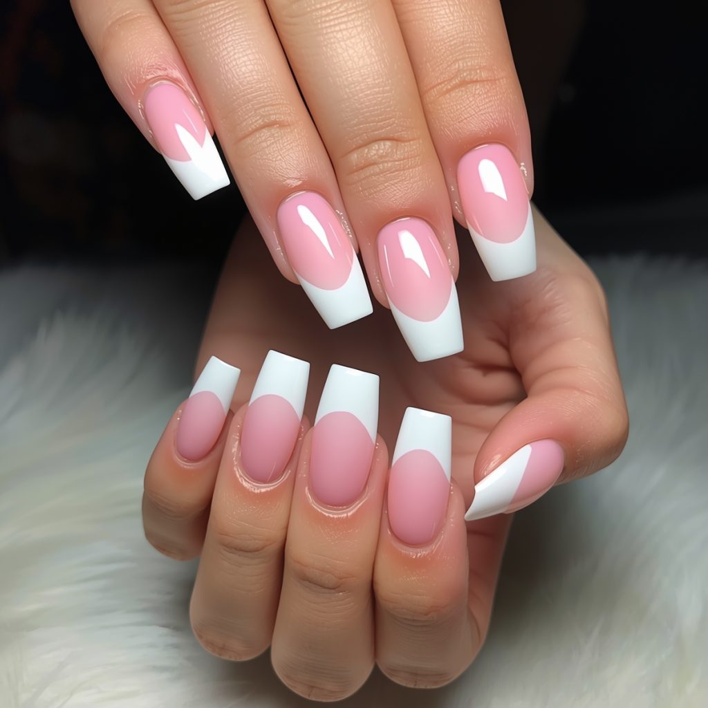 This timeless manicure features extra-long coffin (ballerina) shaped nails with a soft nude-pink base and crisp, bright white French tips. The tips are painted in a clean, slightly angled smile line that follows the natural curve of the nail bed, giving a sharp yet elegant finish. A high-shine glossy top coat enhances the glassy reflection and adds durability to the acrylic or gel extensions.