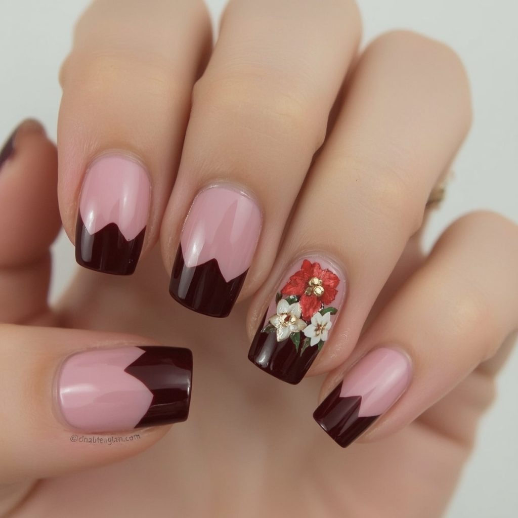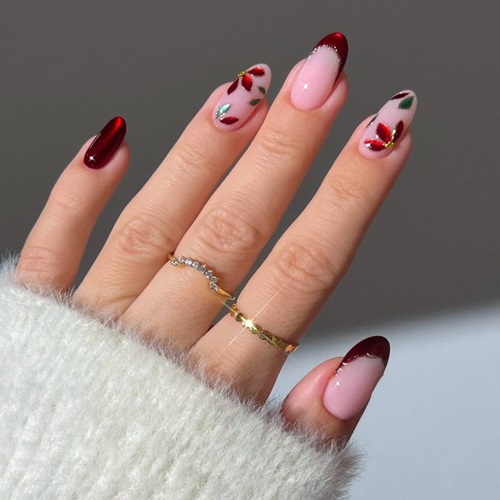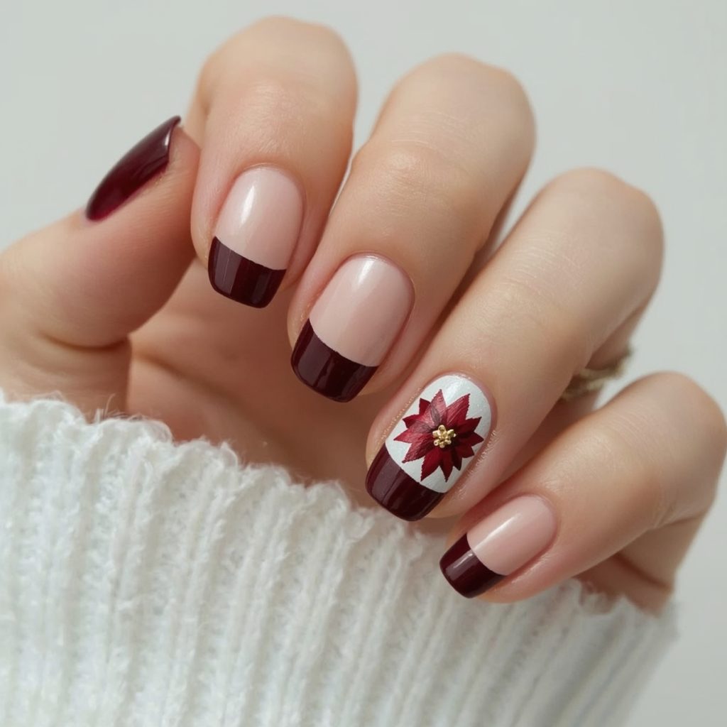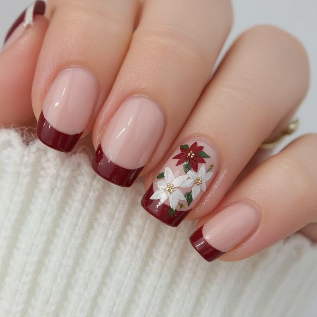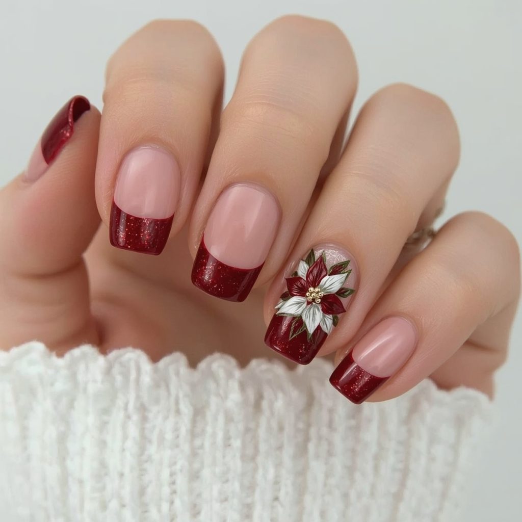 A festive yet refined holiday manicure that captures the magic of Christmas in the most elegant way. Soft blush-pink almond nails serve as the perfect canvas for deep cherry-red French tips that mirror the rich hue of poinsettia petals. On the middle and ring fingers, delicate hand-painted poinsettias bloom in crimson and white with tiny gold foil centers, adding subtle sparkle and seasonal charm without overwhelming the minimalist aesthetic.